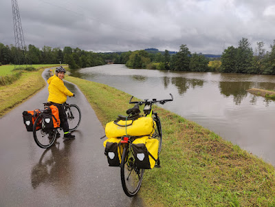 Towards the end of yesterday, we reviewed today's route and decided that given the horrible weather forecast (which turned out to be spot on), we'd make a change to our route and drop down to the River Meuse and the Meuse Canal that runs alongside the river, as soon as we could and then follow the path we'd cycled earlier in the trip (EV19) but in the reverse direction. This would add a few miles to the distance but be easier and doubtless faster than the original plan which meandered through the hills and valleys to the north of the Meuse.
